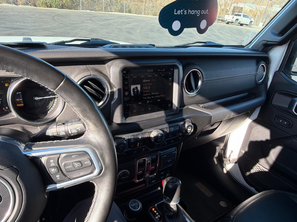 Enough room to carry all your cargo, passengers and equipment on a long road trip. Offering a ride height that is above most other vehicles, this Jeep Wrangler 4xe has great visibility on the road. When you encounter slick or muddy roads, you can engage the four wheel drive on this unit and drive with confidence. This vehicle has auto-adjust speed for safe following. This model offers Android Auto for seamless smartphone integration. Apple CarPlay: Seamless smartphone integration for this unit - stay connected and entertained on the go! This 1/2 ton suv keeps you comfortable with Auto Climate. Protect this model from unwanted accidents with a cutting edge backup camera system. Set the temperature exactly where you are most comfortable in it. The fan speed and temperature will automatically adjust to maintain your preferred zone climate. Easily set your speed in this model with a state of the art cruise control system. Increase or decrease velocity with the touch of a button. The Electronic Stability Control will keep you on your intended path. This Jeep Wrangler 4xe has a 4 Cyl, 2.0L high output engine. This 2021 Jeep Wrangler 4xe 's Forward Collision Warning feature alerts drivers to potential front-end collisions. Bluetooth technology is built into this vehicle, keeping your hands on the steering wheel and your focus on the road. Keep your hands warm all winter with a heated steering wheel in this model . The leather seats in this 1/2 ton suv are a must for buyers looking for comfort, durability, and style. The installed navigation system will keep you on the right path. An off-road package is equipped on it. Start this vehicle from inside with remote start. This unit embodies class and sophistication with its refined white exterior. It is equipped with the latest generation of XM/Sirius Radio.